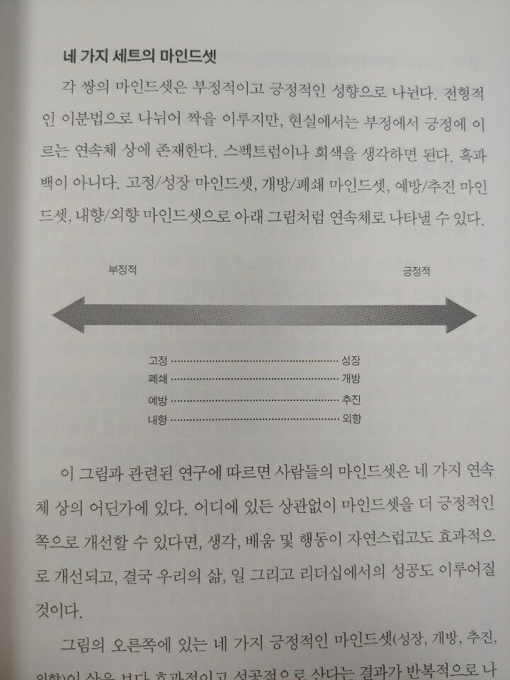 네 가지 세트의 마인드셋은 부정적, 긍정적으로 나누며, 이분법적으로 배치된다. 고정, 성장/폐쇄, 개방/예방, 추진/내향, 외향 중 어딘가에 우리는 존재한다. 이러한 마인드셋을 전환하는 것이 필요하다.