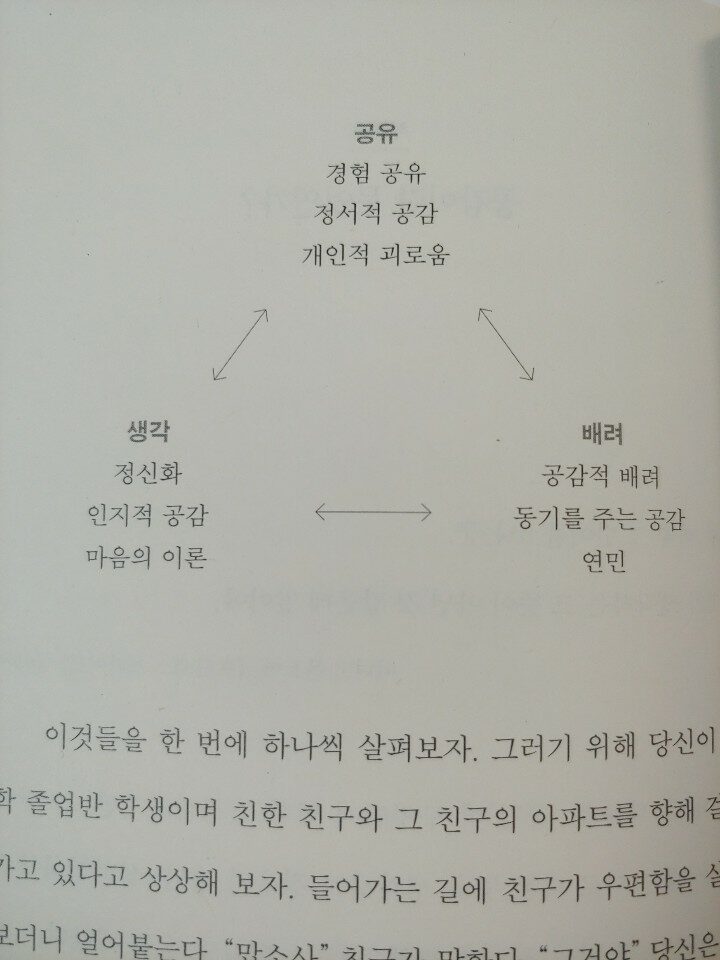 대학원 시절, 한 동기(동기였으나 박사 과정생이였던)가 공감은 훈련되는 것인가에 대한 의문을 가지고 있었다. 이에 대한 구체적인 답이 이 책에서 나왔다고 생각한다. 공감은 여러 방식을 의미하는데, 1)다른 사람들이 어떤 감정을 느끼는지 인지하는 것(인지적 공감), 2)그들의 감정을 함께 느끼는 것(정서적 공감), 3) 그들의 경험을 개선하고 싶은 마음(공감적 배려)이다(12).