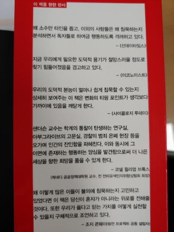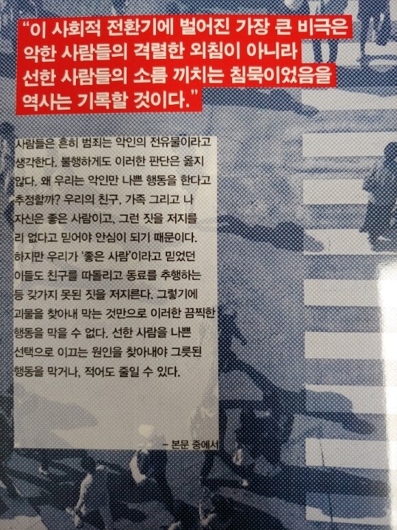 좋지 않은 행동 앞에서 우리는 왜 침묵하는가? 란 질문에 답하는 책이다. 그리고 악인만 나쁜 행동을 한다고 추정할 수 있을까?, 왜 사람들은 군중 속에 있을 때 혼자서는 하지 않을 행동을 하는 것일까?, 유명한 밀그램의 실험에서 우리가 배울 수 있는 것은 무엇일까? 에 대해 책을 통해 알 수 있을 것이다.