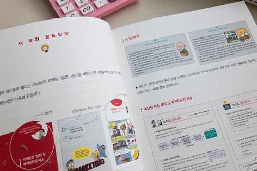 재미로 읽는 만화책이라고 하지만, 마케팅이라는 학문을 배우기 위한 책이니 뭔가 적절한 활용방법부터 알고 들어가야겠죠? 친절하게 첫 부분에 설명이 있더라고요. 만화로 재미나게 읽고 나서는 ‘교수의 강의노트’에서 핵심정리를 한번 해주고, ‘스스로 정리하기’에서 셀프 체크까지.. 오호라! 완벽한 구성인데요! 대학 교재로 어려운 원서를 보지 말고 이 책으로 공부해도 되지 않을까 싶더라고요.