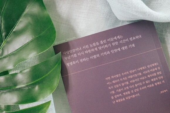 하지만, 가장 공감 가는 글귀는 바로 이거였어요. 사랑은 성장이라는 이야기.. 사랑하는 행복에서도, 이별 후의 아픔에서도 한 단계 성숙해진다는 것은 이미 알고 있는 사실이었으니까요. 한 번의 사랑과 한 번의 이별을 할 때마다 조금씩 조금씩 어른이 되어갈 수 있었으니까요. 역시 어른은 그냥 되는 게 아니었더라고요.