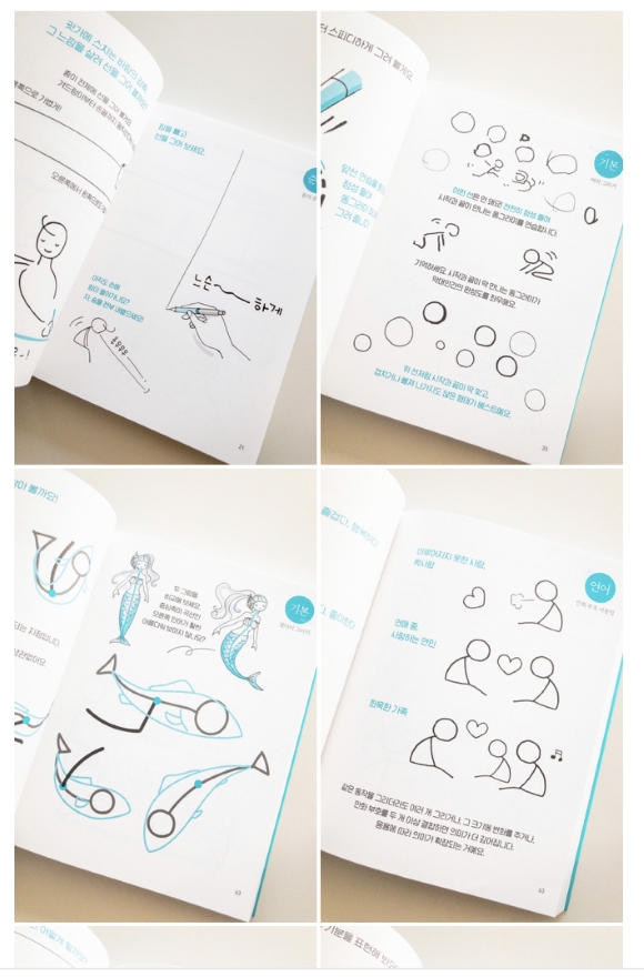 그림을 포기한 사람이라도 쉽게 시작할 수 있도록 기본부터 시작하고 있네요. 가장 기본은 당연히 선 긋기와 동그라미 그리기!! 막대 인간은 그거면 끝이잖아요^^ 그리고 머리와 몸과 팔다리의 배치부터 다양한 기본 기술부터 차근차근 들어가는데요. 다양한 예시들과 친절한 설명 덕분에 쉽게 따라 그릴 수 있더라고요.