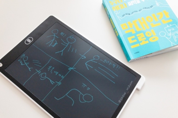 우연히 얼마 전에 전자칠판 하나를 선물 받았는데요. 요즘 여기에다 이것저것 그림 그리기에 재미 붙인 아이에게 막대 인간 드로잉북을 보여줬더니 바로 실습 들어가 버리네요. 책에 있는 재미난 막대 인간들을 따라 그리더니,, 바로 응용으로 들어가 버리는 아이! 멋진 스토리 만화 하나를 완성해버립니다..!!! 저희 집 아이가 천재?는 아닐 테니, 책이 훌륭하나 보네요!