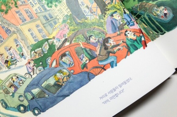 다들 바쁘네요. 그림에 사람도 가득이고 건물도 가득이고 자동차도 가득입니다. 가브리엘의 머릿속도 가득이고 엄마도 해야 할 일이 가득입니다. 사람들의 목소리도 표정만큼 날카로운 금요일 오후네요. 어휴~ 가브리엘은 이런 도시에서 어떤 주말을 보내려는 걸까요? 복잡한 머리가 더 복잡해지는 주말이 기다리고 있는 건 아니겠죠?