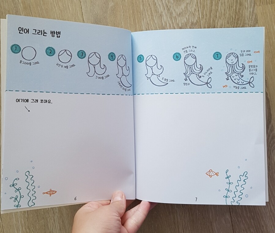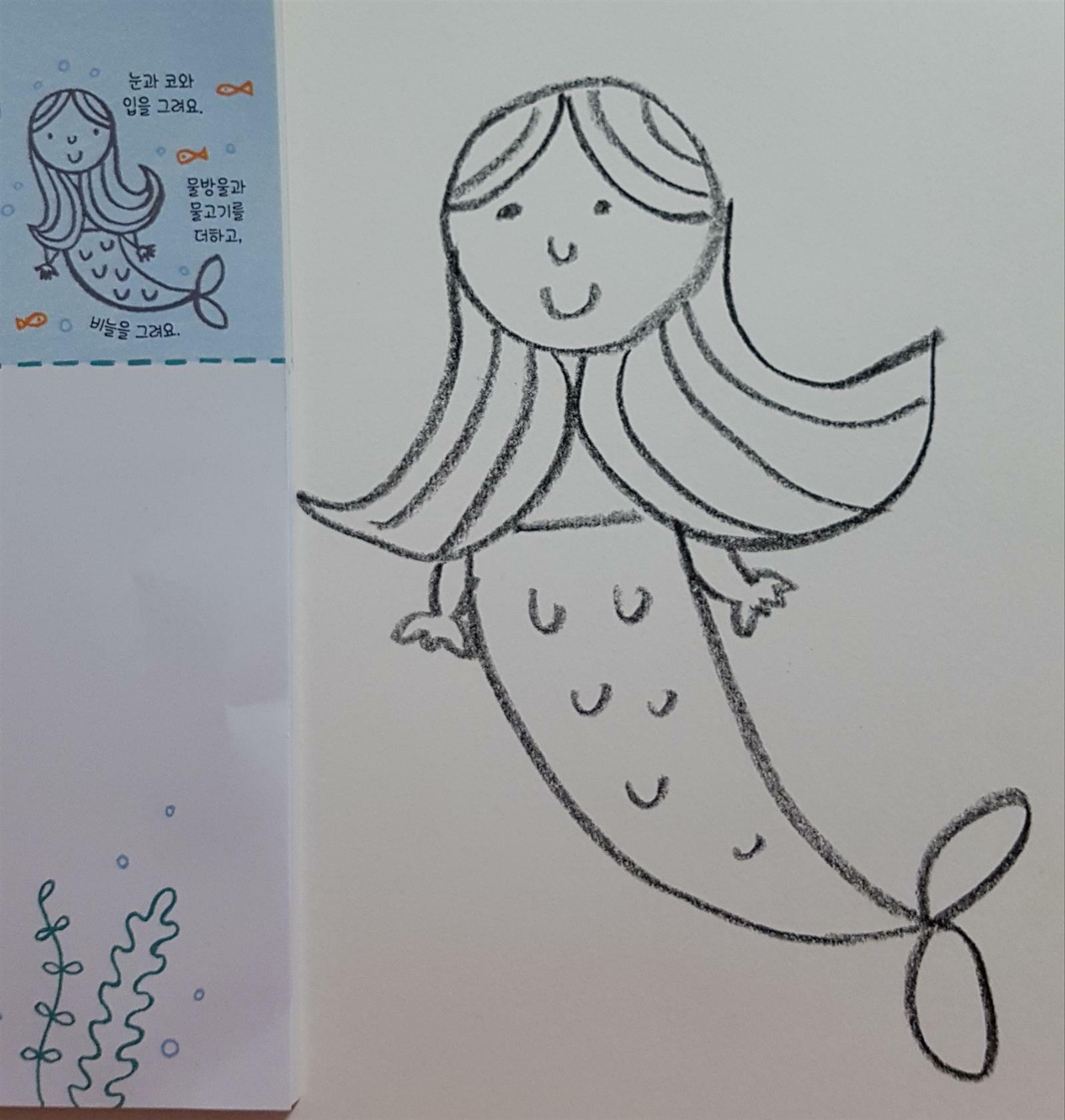 인어 그리는 쪽을 펼치면 상단에 인어 그리는 방법이 순서대로 설명되어지고 아래편에 그릴 수 있는 공간이 따로 있어요.