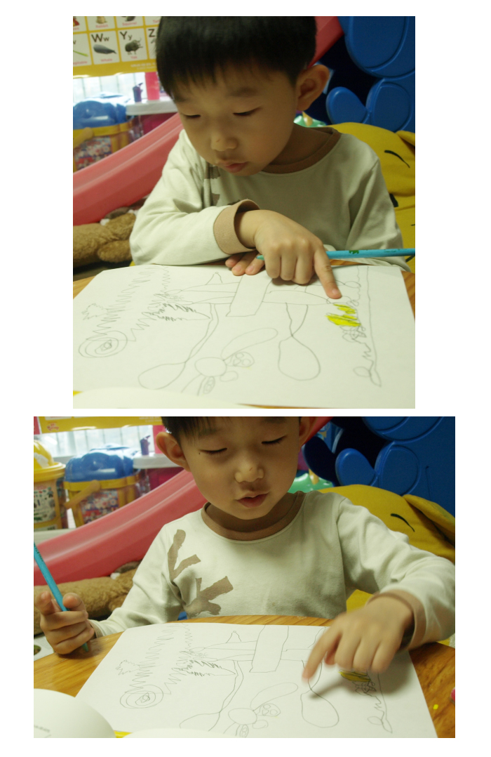 노랗고 길쭉한 무당벌레 알이 예쁘고 신기했는지 나무부터 그리고 알도 그리고 노랗게 색칠도 해줍니다.