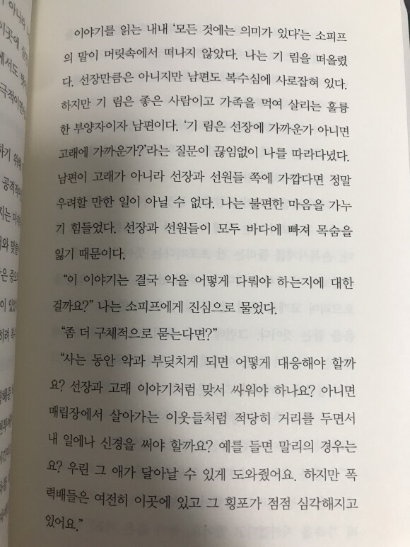 그는 끈질기게도 차근차근 자신의 윤리와 정의에 대해 예를 들어가며 설명해준다.