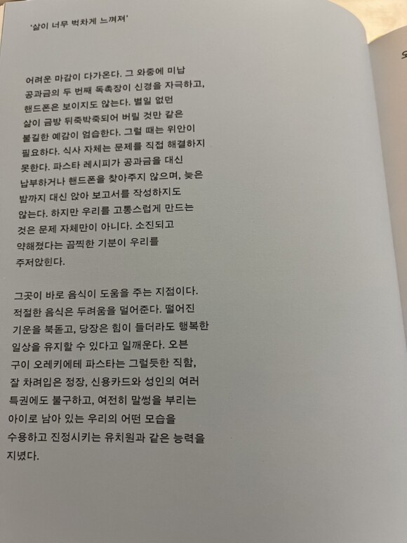 요리를 소재로하여 부드럽고 즐거운 마음으로 책을 읽을 수 있어서 신선하다고 생각했다.