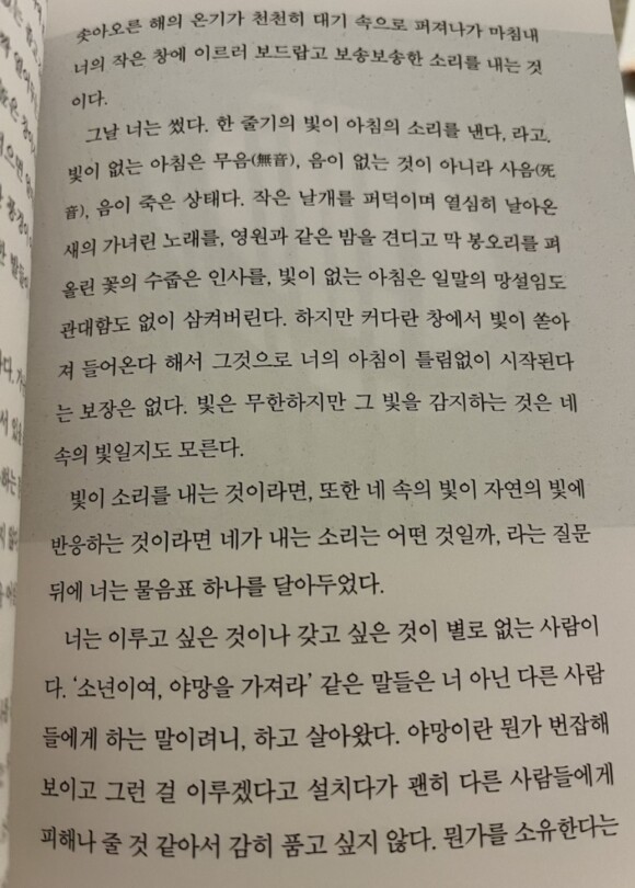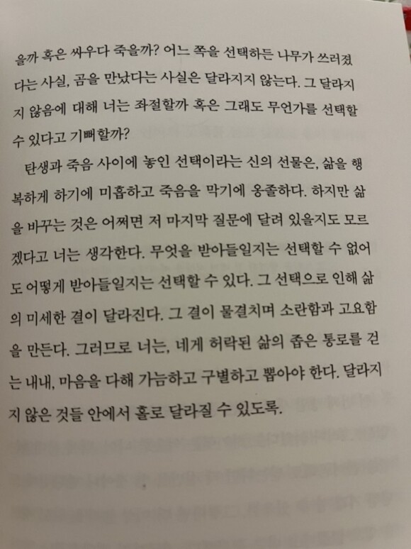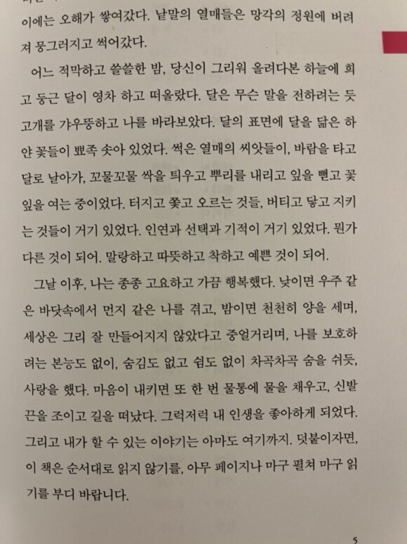 "그날 비양도의 모든 여정은 나를 한 뼘 더 성장시켰다. 비록 길을 헤매고 돌아 몸은 지치고 힘들었지만, 나는 안다. 낯선 길을 만난다는 건 내가 나아가야할 길을 깨닫는 여행과도 같다는 것을. 그래서일까. 가끔은 이런 사소한 실수에서 생기는 불편함이 그리울 때가 있다. 분명 완벽하다고 생각했는데 어긋나기도 했었고, 땀에 흠뻑 젖어 우스꽝스러운 모습이 된 적도 있었다. 비양도의 그날처럼. p229"