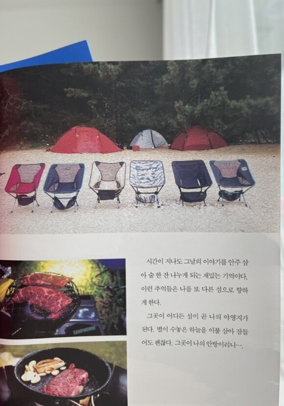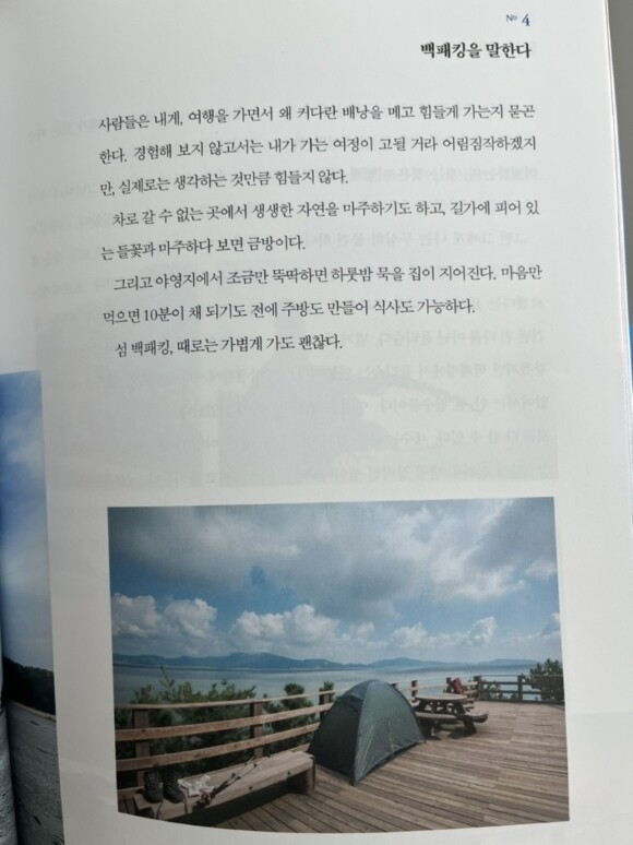 "시간이 지나도 그날의 이야기를 안주 삼아 술 한 잔 나누게 되는 재밌는 기억이다. 이런 추억들은 나를 또 다른 섬으로 향하게 한다. 그곳이 어디든 섬이 곧 나의 야영지가 된다. 별이 수놓은 하늘을 이불 삼아 잠들어도 괜찮다. 그곳이 나의 안방이라니 ....'