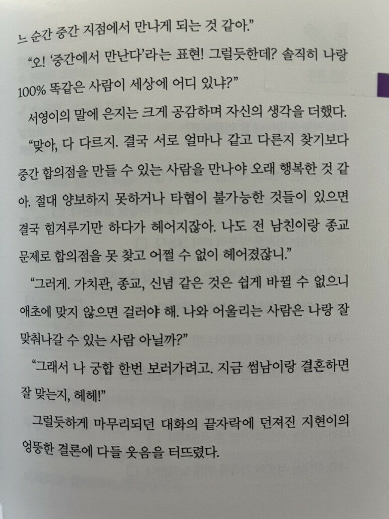 중간 합의점을 만들 수 있는 사람을 만나야 오래 행복한 것 같다는 말