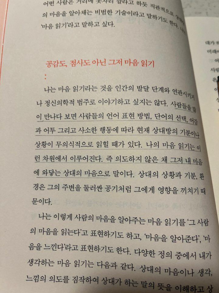 - 사람들을 많이 만나다 보면 사람들의 언어 표현 방법, 단어의 선택, 어감과 어투 그리고 사소한 행동에 따라 현재 상대방의 기분이나 상황이 무의식적으로 읽힐 때가 있다. 나의 마음 읽기는 이런 차원에서 이루어진다. 즉 의도하지 않은 채 그저 내 마음에 와닿는 상대의 마음으로 말이다.