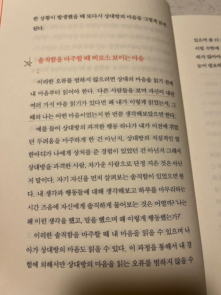다른 사람들을 보며 자신이 내린 여러 가지 마음 읽기가 있다면 왜 내가 이렇게 읽었는지, 그때의 나는 어떤 마음이었는지 한 번쯤 생각해보았으면 한다.