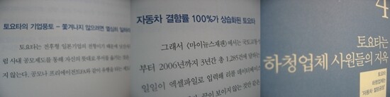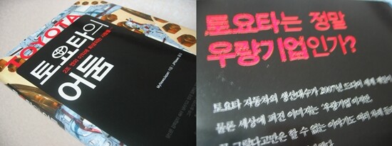 이전에 읽었던 책에서 토요타의 생산방식에는 '인간 존중의 철학'과 이를 토대로 전 직원이 참여하는 '지속적인 개선'이라는 주춧돌이 놓여있다고 했다. 아무리 시스템이 훌륭하더라도 그 시스템을 움직이는 사람의 경쟁력이 수반되지 않으면 제대로 성과를 낼 수 없기 때문에 사람의 경쟁력이야말로 진정한 경쟁우의의 요소라고 했다. 당시에 이 글을 읽으며 고개을 끄덕였지만 이 책을 읽고 난 후 달라진 것은 이것은 이제 토요타에 해당하는 말이 아니라는 점이다. 일하는 노동자와 소비자 측면에서 우리 기업들도 이런 문제점들을 안고 있는 건 아닌지 이번 토요타사태를 계기로 점검해 보고 타산지석으로 삼도록 해야하겠다.