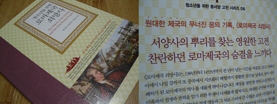 《청소년을 위한 로마제국 쇠망사》는 저자가 원문을 편역하고 해설한 책이다. 중간중간 내용과 관련있는 원문을 인용하기도 했고 칼라사진과 그림을 통해 내용의 이해를 돕고 있다. 1,300 여 년의 역사를 한 권에 담았기에 한 눈에 빠르게 읽을 수 있지만 로마역사가 생소한 독자들에게는 시간의 흐름을 따라 수없이 나열되는 황제들과 주위 인물들 때문에 무척 혼란스럽게 느껴질 수도 있을 것 같다.
