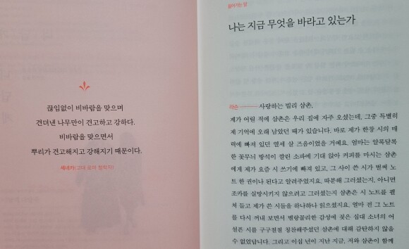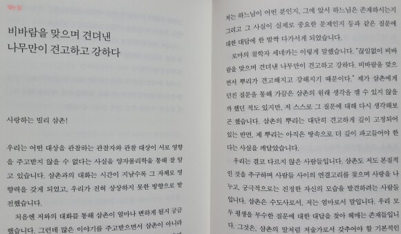 ‘참으면 병이 된다’는 말씀을 지키지 않고, 나는 병이 되기 전에 꼭 어딘가에 쓰고 남겼다. 영원히 박제된다는 생각은 전혀 부끄럽지 않았다. 말하지 않는 것이 오히려 더 아픔이 될 거라 생각했기 때문에.(이소호)