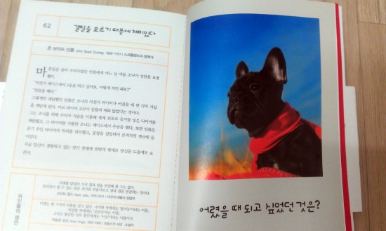 개를 소재로 해서 이렇게 책을 펴낼 수 있는지 신기하기도 했다. 일본인들이 개를 가족처럼 사랑한다는 이야기는 많이 들었지만, 강아지로부터 교훈을 얻고 배움을 얻는다는 것 자체가 나에겐 신선한 충격이었다.