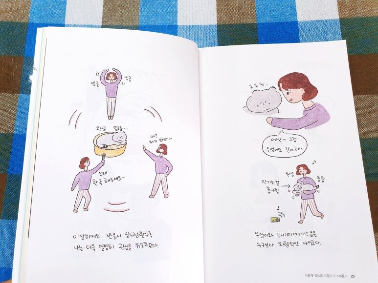 보기만해도 마음이 이렇게 녹아내리는데 저자의 마음은 오죽할까. 예술가들에겐 소위 ‘뮤즈’란 것이 있는데, 저자에게 뮤즈를 뽑으라면 단연코 우엉이, 오니기리다. 저자가 그림을 그리는 일을 업으로 삼은 이래로 가장 많이 그린 것이 바로 고양이, 자신의 고양이들이다. 일일이 세어보진 않았지만 적어도 수십 권의 노트와 수천 장의 종이를 우엉이와 오니기리로 채워 넣었을 것이다. 아침에 일어나면 세수를 하고, 점심에는 밥을 먹고, 밤에는 잠을 자는 익숙한 일상처럼, 우엉이와 오니기리를 관찰하고 끄적이는 일은 점차 몸에 깊숙이 배어갔다. 고양이도 사람과 마찬가지로 저마다 고유의 개성을 지니고 있는데, 가만히 들여다보면 외형도 성격도 성향도 그야말로 가지각색. 그때는 몰랐다 우리가 이렇게 매일 살을 맞대고 살아가는 가족이 될 줄. 그렇게 하루하루 조금씩 서로의 일상으로 스며들었다.