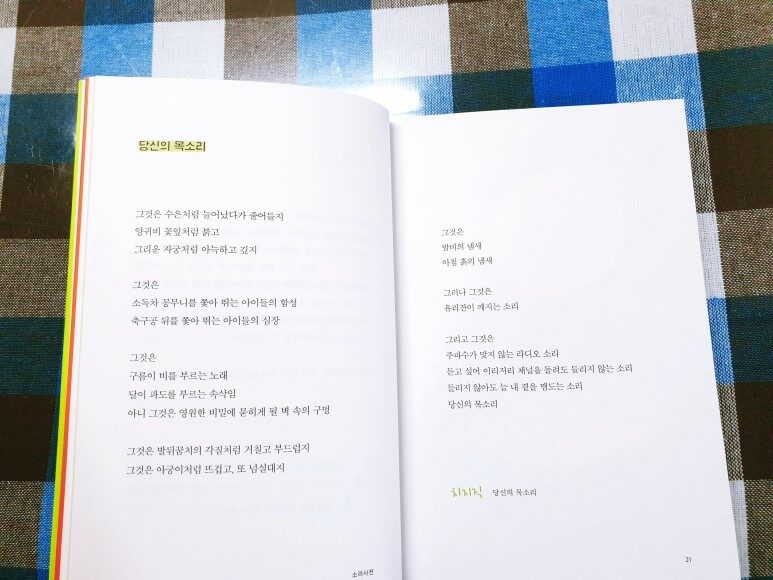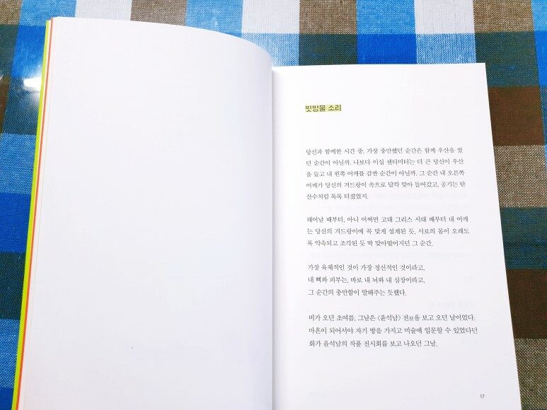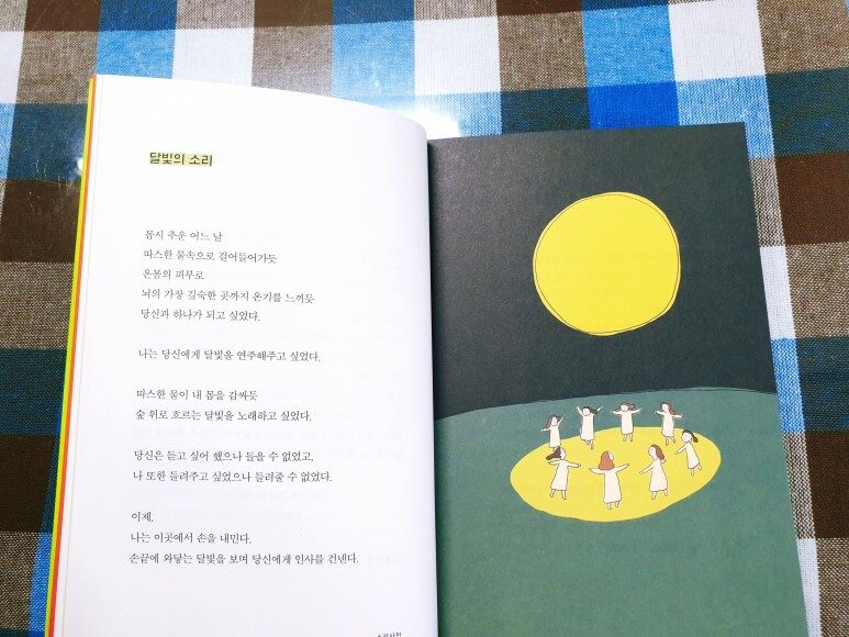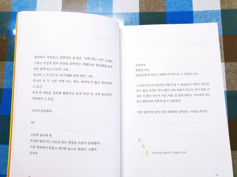 소리사전이라니, 이게 가능할까? 글로 소리를 듣는다고? 세상에 존재하는 모든 것들에 저마다 고유의 소리가 있긴 하지만 그걸 책을 통해서, 그러니까 책을 읽으며 들을 수 있을거라고는 생각 조차 못해봤다. 그런데 이게 가능하다? 그래서 정말 깜짝 놀랐다. 각각의 소리를 모아 놓은 글을 마음속으로 다시 되뇌이며 읽으면 어느샌가 달빛의 소리가 들리고, 마음에 비 오는 소리, 까치의 웃음소리, 종이가 연필을 만날 때 나는 소리, 모닥불 타는 소리, 아이가 달려가는 소리, 가위질 소리, 자몽에이드 얼음 녹는 소리, 개구리 소리, 마음이 멍드는 소리, 모기의 소리, 눈 오는 소리 등 여러 가지 소리가 하나 둘씩 들려온다. 모두 보고 듣고 느끼는 마음의 소리들. 일상생활에서 흔하게 들을 수 있는 것들이지만 어째 평소와는 확연히 다르다. 콩닥콩닥, 후후, 위이잉, 땍땍땍, 띵똥, 푸드덕 푸드덕, 타닥타닥, 콩콩콩, 평소 자주 듣던 소리들이라 귀에 익숙하지만 마음속에서 하나씩 재생되는 소리들은 어째서인지 더 집중해서 듣게 되고 그만큼 더 깊숙이 파고들어 또렷하게 들려온다. 사뭇 새삼스럽다. 가만히 앉아있던 글자에 소리가 더해지더니 글자가 갑자기 공중을 붕붕 떠오르고 생기있고 발랄한 모습으로 변해버렸다. 분명히 알고 있는 것들인데 모든 소리가 하나하나씩 분리되어 그에 웃기도 하고 가슴 찡한 감동을 받기도 하고 적잖게 위로 받으며 특별한 의미를 더해 새롭게 다가온다.