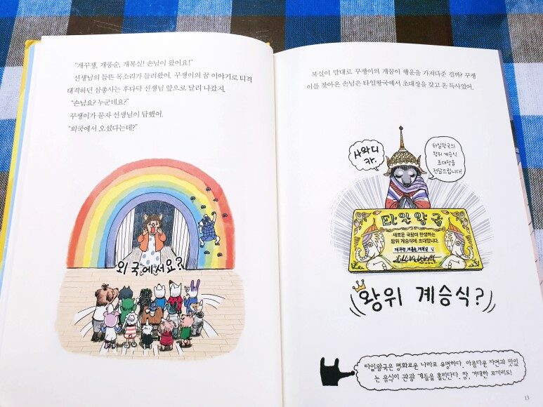 복실의 말대로 꾸쟁이의 개꿈이 행운을 가져다준 걸까? 꾸쟁이를 찾아온 손님은 타일왕국에서 초대장을 갖고 온 특사였어. (p.12)