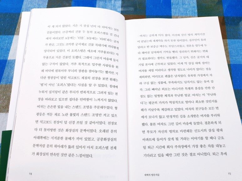 철컥. 걸쇠가 걸리며 문이 잠기는 차가운 쇳소리가 복도에 울려 퍼졌다. 남자가 고개를 번쩍 들었다. 번호 키를 누르는 소리가 멈췄다. 남자와 눈이 마주쳤다. 여자의 머리카락이 곤두섰다. 마치 남자가 자신을 쳐다보고 있는 것만 같았다. 아니야, 저 사람한테 내가 보일 리 없어. 아무리 되뇌어봐도 소용이 없었다. 눈동자보다도 작은 렌즈가, 커다란 유리문이 된 것 같은 기분이었다. 문밖의 남자가 자신을 훤히 들여다보고 있는 것처럼 느꼈다. 그는 뭔가 발견했다는 듯 점점 가까이 다가왔다. 동그랗게 뚫려 있는 여자의 시야에 남자의 상반신이, 어깨가, 얼굴이 ······ 그리고 마침내 새까만 눈동자가 가득 들어왔다. 남자가, 렌즈를 빤히 들여다보고 있었다. (p.23)