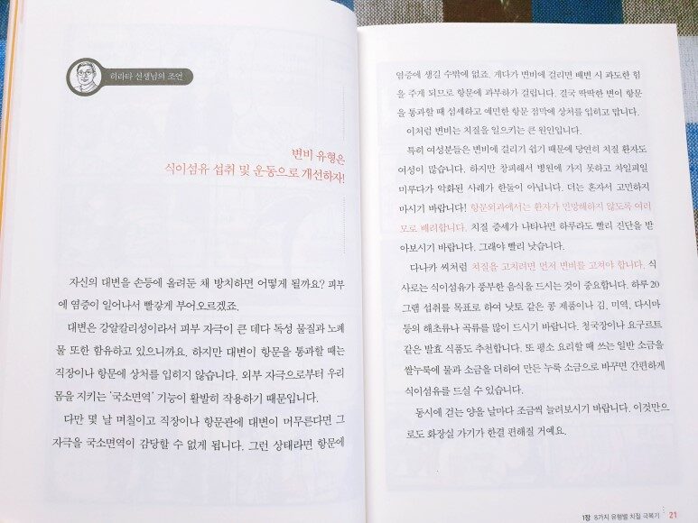 항문 주변에는 동맥과 정맥이 그물코처럼 밀집되어 있습니다. 그런데 체온이 내려가면 혈관이 수축되어 혈액순환이 잘 되지 않기 때문에 자칫 염증이 생기기 쉽습니다. 바로 이 염증이 치질을 일으키는 주범입니다. 최근 여름철 냉기에 따른 치질이 급증하면서 ‘치질은 여름 질환’이라는 말까지 나올 정도랍니다. 집에서는 에어컨을 마음대로 조절할 수 있지만 직장에서는 그러기 힘들죠. 그러니 무릎 담요를 준비하는 등 스스로 대책을 세워야 합니다. 특히 냉증 방지에 효과적인 제품으로 일회용 발가락 핫팩을 추천하고 싶습니다 신발 안쪽이나 양말 바닥의 발가락 부분에 붙이기만 하면 되니까 간편합니다. 동시에 발열 기능으로 발끝까지 따뜻하게 체온을 지켜줍니다. (p.50)