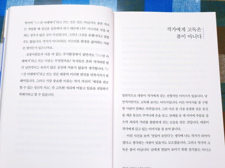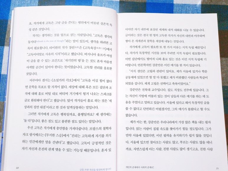 인간은 작은 존재입니다. 세상은 어마어마하게 크고요. 그런데 세상이 아무리 커도 작은 나를 통해서만 인식이 가능합니다. ‘나’라는 존재는 세상이 인식되는 유일한 통로입니다. 글쓰기는 그렇게 인식된 것을 쓰는 것입니다. 글쓰기는 세계를 인식하는 유일한 통로인 자신을 가장 적극적으로 활용하는 방식입니다. 글 쓰는 사람은 홀로 앉아 세상일에 대해 이래저래 따져 봅니다. 인간의 사유 대상은 세계입니다. 글쟁이 하나가 감히 세상 전체를 대상화해서 분석하고 해석하겠다며 덤비는 것입니다. 작은 내가 거대한 세상을 상대로 벌이는 정면 대결입니다. (p.16)