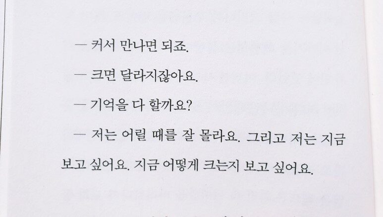 한솔은 이제 못 보게 된 아이들은 영영 못 보게 될 아이들처럼 여겨졌다. 아이는 사람의 인생에서 너무 짧은 시기여서 못 보게 된 아이들은 영영 만날 수 없을 가능성이 높았다. 우리는 어른이 되고 뭔가 빼먹은 얼굴이 돼서 만난다. 그건 못 보는 것과 같지 않을까. 그게 아니라면 전혀 새로운 사람과 만나는 것이 아닐까. 새로운 사람으로 다음 장면 같은 장소에서 만나는 것이겠지. (p.26)