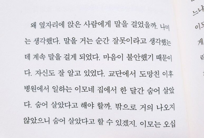 사람들은 나를 해치지 않는다. 사람들은 나를 붙잡지 않는다. 나미는 그런 확신을 얻기 위해 어쩌면 열차 옆에 앉은 사람에게 말을 걸었는지도 모르겠다는 생각이 들었다. 그러고 보면 교단에 누가 끌고 간 것도 아니고 거기서 채찍질을 당하거나 감금을 당한 것도 아니다. 굶기지도 않았고 강압적으로 요구 받은 것도 없었다. 학교도 다녔고 외출도 했다. 다만 교묘하게 일상이 교단을 중심으로 짜이게 되었고 점점 공동생활 밖으로 나가지 않게 되었다. 사라진 사람들이 있다는 것을 깨달았을 때 문득 주변이 다르게 보였다. 나미는 어쨌거나 도망을 쳤다. 그것이 중요하다는 생각을 했다. (p.64)