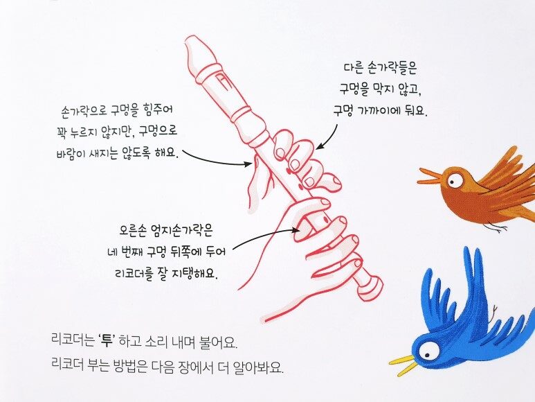 리코더 부는 방법을 익혀요.
