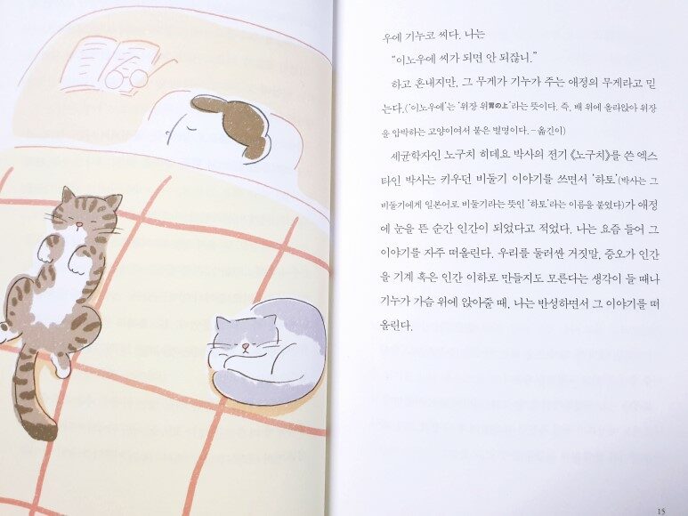 기누는 지금도 잘 울지 않는다. 처음에는 방랑 여행 중에 하도 울어서 목소리를 잃은 줄 알았는데, 언제던가 내 뒤를 쫒아와서는 큰 소리로 울어서 깜짝 놀랐다. 남자 친구와 대화할 때도 귀여운 목소리로 울었다. 한심하게도 멍청해서 쥐도 잡지 못한다. 기누가 할 줄 아는 것이라곤 한 인간을 믿고 절대 의심하지 않는 것이었다. 한밤중에 기누가 가슴 위에 앉는 바람에 나는 괴로워하며 잠에서 깰 때가 자주 있다. 기누는 이불 위에서 커다란 눈으로 나를 빤히 내려다본다. 그래서 기누의 이름이 또 늘었다. 이노우에 기누코 씨다. 나는 “이노우에 씨가 되면 안 되잖니.”하고 혼내지만, 그 무게가 기누가 주는 애정의 무게라고 믿는다. (배 위에 올라앉아 위장을 압박하는 고양이어서 붙은 별명) (p.13)