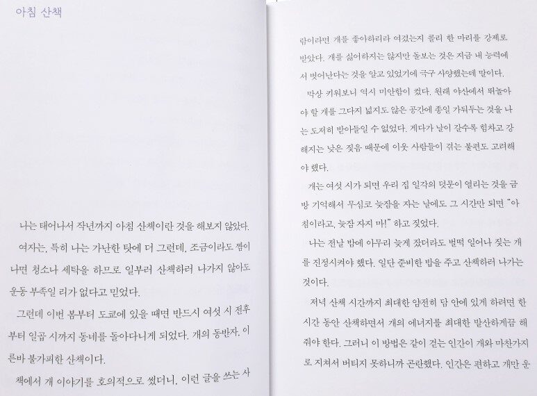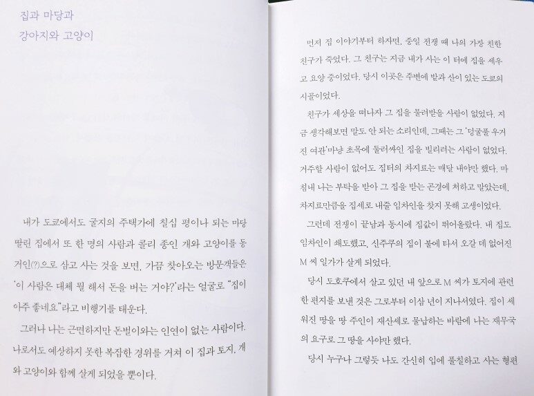 소설가 에쿠니 가오리가 사랑한 작가 이시이 모모코. 그녀가 써내려 가는 일상의 소소한 이야기들. 책에는 그녀가 편집자, 번역가, 작가로 활약하며 써온 따뜻하고 감성적인 39편의 에세이가 수록되어 있다. 계절이 바뀌어 가는 시간들, 어린 시절의 가난했지만 풍요로웠던 추억, 전쟁이 끝난 직후 도호쿠의 시골로 내려가 밭을 일구고 소를 키우던 시절의 기억, 크게 다쳐서 마당에 흘러들어와 강제로 집 안까지 들어오게 된 고양이 기누와 콜리 종 강아지 이야기를 글로 쓴 인연으로 누군가가 “당신, 개 좋아하죠? 얘 줄게요.”라며 두고 간 강아지 듀크와의 인연 등 일상의 소소한 이야기들을 유머러스하게 그려내며 따뜻한 위로의 손길로 책 곳곳에는 따스함이 가득 묻어난다. 책 한 권으로 잠시 들여다본 그녀의 일상은 정말이지 유쾌했다. 한 장 또 한 장 페이지를 넘길 때마다 이번에는 또 어떤 이야기를 들려줄지 기대하게 만든다. 모든 것을 빠르게, 빨리 빨리! 천천히 가기보다 서두르길 바라고 눈에 띄는 결과는 바라는 사회에서 살다 보면 나도 모르게 조급해지기 마련. 이리저리 바쁘게 지내다 보면 어느샌가 해는 저물어 있고 지친 몸을 이끌고 집으로 돌아가 잠에서 깨어나면 어김없이 다시 시작되는 하루. 허둥지둥 급하게 시간들을 흘려 보내고 잠시 여유를 되찾았을 때의 느낌이 이와 비슷하지 않을까. 책을 읽다 보면 바쁜 시간을 비집고 여유라는 녀석이 슬그머니 고개를 들이밀고 들어온다. 상처 입은 고양이를 어떻게 받아들였는지부터 시작해 하루아침에 마법처럼 감쪽같이 사라져 버리는 천방지축 강아지 듀크의 이야기며 전쟁이 끝난 해 농촌으로 내려가 먹을 것이 부족하여 힘든 상황 속에서도 절망에 빠지기보다는 나름의 유쾌함으로 주변 사람들과 함께 어울려 집을 짓기도 하고 떡을 만들어 먹으며 어려운 상황을 즐겁게 바꾸어 나가는 이야기 등 특별하기보다는 오히려 너무나 평범해서 사이좋게 어울려 키득키득 웃다 보면 나도 모르게 이야기에 녹아든다. 책 곳곳에 자리 잡은 기쁨과 행복 그리고 여유 덕분에 이 시간만큼은 그 어떤 걱정도 잠시 내려놓은 채 편하게 즐길 수 있다. 아무 생각 없이 마음 편히 쉬고 싶을 때 읽으면 딱 좋을 그런 책이다.