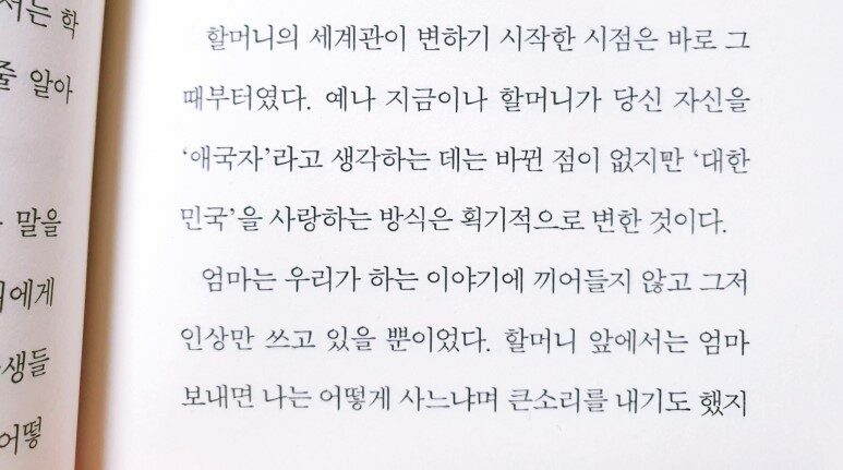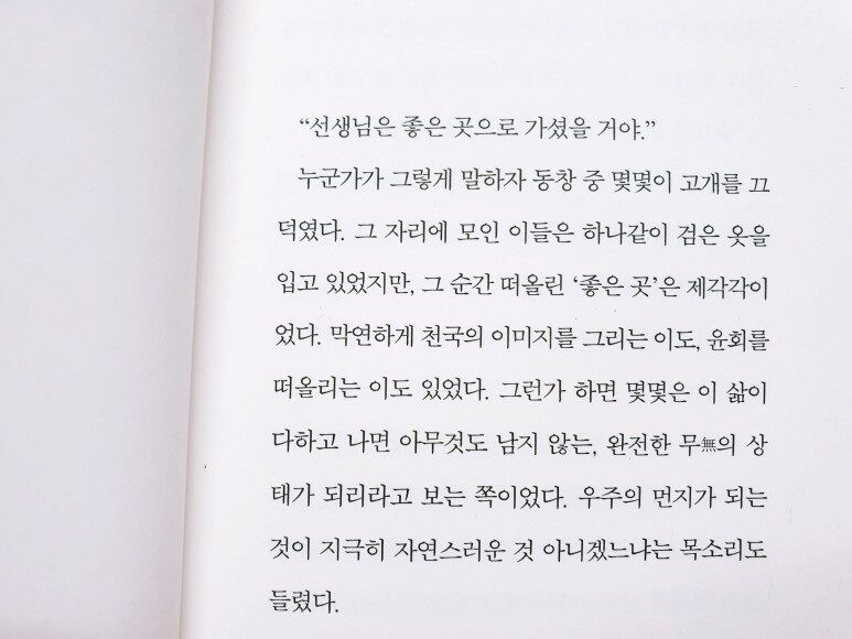 눈물이 핑 돌았다. 나는 지금까지 한순간도 할머니의 선택을 지지하지 않은 적이 없었다. 하지만 이후에 벌어질 일에 대해 온전히 다 알지 못한 채 말이 앞섰을지 모르겠다는 생각을, 그 순간 처음으로 했다. 할머니는 말수가 없어진 나를 물끄러미 들여다보았다. 나는 당장 아무 말도 할 수 없었다. 다음 순간, 내 눈에 들어온 것은 할머니의 손이었다. 할머니는 무릎 위에 가만히 손을 올려놓았는데 손끝이 미세하게 떨리고 있었다. 내 시선을 의식했는지 할머니는 천천히 고개를 들었다. “지쳤다. 이제 정말 숟가락 들 힘도 안 남았어.” (p.75)