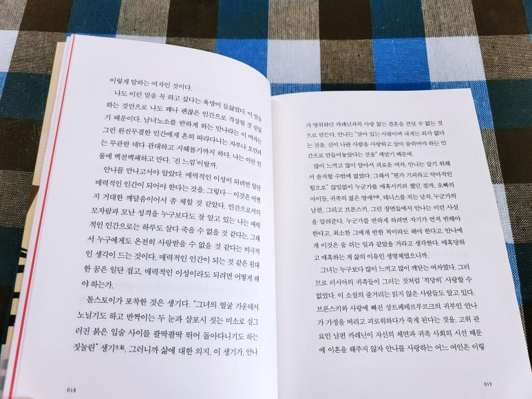돌아온 브론스키는 말한다. 우리의 사랑은 강해졌으며, 우리는 영원히 행복할 것이라고. 이렇게 적어보니 가소롭기 짝이 없지만, 사랑이라는 게 그렇다. 사랑의 말들은 한 발짝 떨어져서 보면 유치하고 졸렬하기 그지없다. 이 사랑의 맹세 때문이었을까? 안나는 회복된다. 이 ‘유사 죽음’의 체험이 안나에게 남긴 교훈은 이렇다. ‘사랑이 위험해졌을 때는 죽음을 이용하라.’ 그러나 불행히도, 사랑은 다시 식는다. 예견된 일이다. 동화가 아닌 소설의 세계에서 ‘공주님과 왕자님은 영원히 행복하게 잘 살았습니다’ 따위의 알량한 플롯은 허락되지 않기 때문에. (p.25)