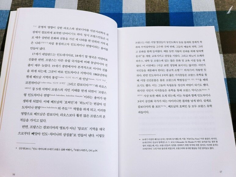 보시다시피 이 책은 여행기다. 책의 제목처럼 베트남, 라오스, 캄보디아 3국의 커피, 누들, 비어를 따라 떠난 여행을 정리하여 엮어 놓은 것이다. 이 여행의 시작은 라오 비어에서 비롯되었다. 생전 처음 들어본 라오 비어, 라오스에서 생산되는 이 맥주가 맛있다는 입소문은 저자로 하여금 인도차이나에 대한 호기심을 자극했고 우연히 지인에게서 이 맥주를 건네받은 이후에는 이 맛있는 맥주를 다시 한번 경험하고자 스스로 여행을 기획했다. 그러다 국내 모그룹에서 운영하는 베이커리 브랜드에서 라오스 커피를 수입한다는 사실을 알게 되었고 이는 베트남의 커피와 쌀국수, 맥주로 확대되어 관련 자료를 탐색하는 과정에서 알게 된 사실을 바탕으로 인도차이나의 커피, 누들, 비어, 그리고 프렌치 컨셉으로 여행을 떠나게 만들었다.