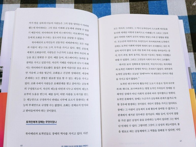 미국 장애의 역사는 미국 역사 전체가 그러하듯, 복잡하고 모순적인 이야기다. 그것은 약탈당한 땅과 몸에 대한 이야기다. 옳고 그름에 대한, 황폐함와 파멸에 대한, 패배와 고집스러운 끈기에 대한, 아름다움과 우아함에 대한, 비극과 슬픔에 대한, 변혁적 아이디어에 대한, 자아를 재창조하는 일에 대한 이야기다. 백인, 장애인, 퀴어 작가이자 운동가인 엘리 클레어의 말을 빌리자면, “우리의 몸을 되찾고 세상을 바꾸는 용감하고 시끌벅적한 이야기다”. (p.316)