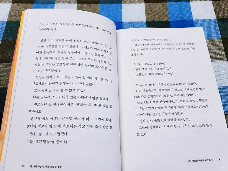‘행복한 죽음’이란 종종 어이없을 만큼 쉽고 편안하다. 불행한 죽음은 그 사람의 죽음을 받아들이지 못하는 가족이, 아니면 우리 의료진이 죽는 사람을 더욱 처절하게 만드는 것은 아닐까. (p.110)