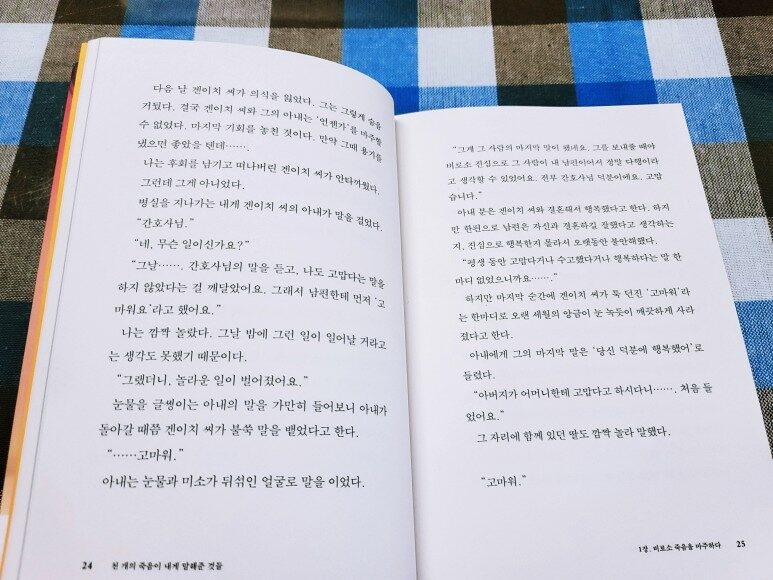 인간은 모두 죽는다는 사실은 그 누구도 부정할 수 없다. 받아들이는 수밖에 없다. 죽지 않는 인간은 없기 때문이다. 그렇다고 해서 어떤 순간이든 삶을 포기하지는 마라. 인간은 자신의 마지막 시기를 결정할 수 있고, 그 시간을 선택함으로써 인생을 더욱 풍요롭게 살아갈 수 있다. (p.84)