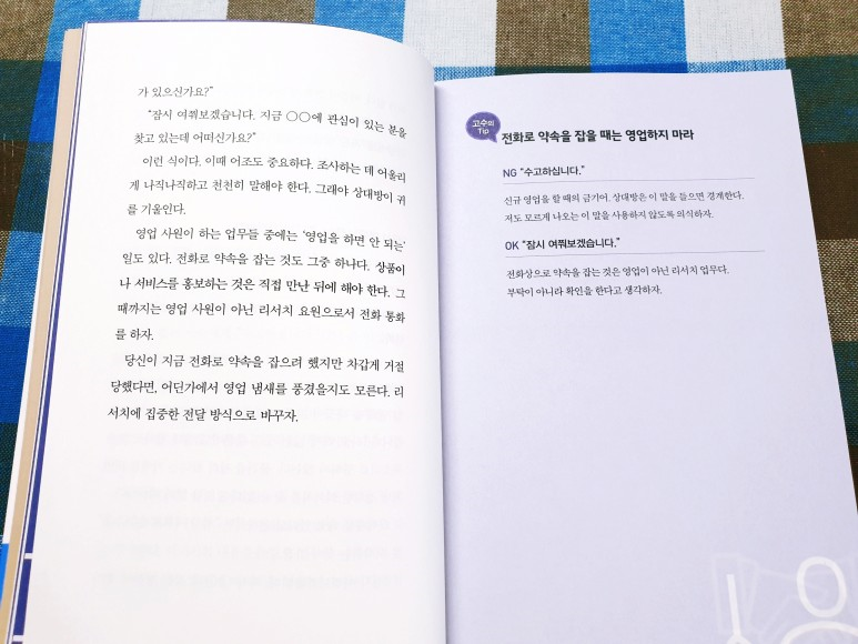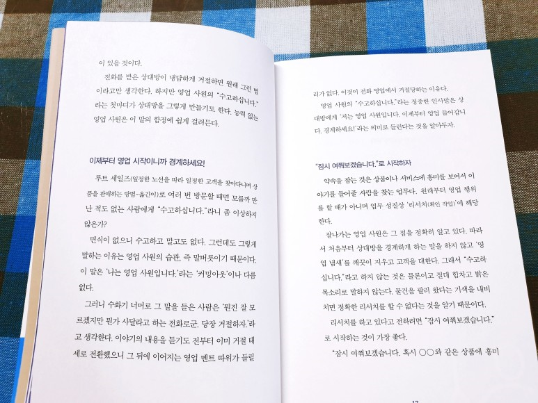 잘나가는 영업 사원은 고객이 거절했을 때 “그렇습니까, 아쉽네요.”라고 하지 않는다. 불만스러운 표정도 절대 짓지 않는다. 아쉽거나 유감이라는 표정은 고객을 ‘거절하기 힘들게’ 만들기 때문이다. 거절할 때마다 아쉬워하는 영업 사원을 다음에 또 만나고 싶을까? 거절하기 힘든 상태를 만들어버리면 아예 고객을 만날 수 없게 된다. 다음에도 마음 편하게 만날 수 있는 관계를 쌓으려면 ‘언제든 거절하셔도 됩니다.’ 라는 태도로 일관해야 한다. (p.158)