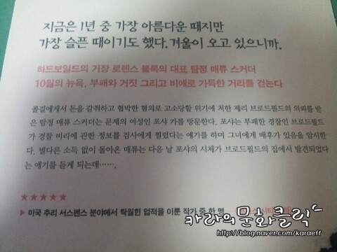 마치 내가 추리소설을 처음접했던 그때의 흥분이 살짝 떠오르기도 했다. 묘사가 뛰어난 소설은 머릿속에 상상력을 더욱 자극시킨다. 상상이라기 보다는 머릿속에 그냥 영상을 떠오르게 한다랄까? 읽으면서 매우 만족스러운 글솜씨였다. 기존 추리,스릴러 매니아들이 본다면 초심으로 돌아간듯한 신선함을... 그리고 이런 장르를 처음 접하는 사람들에게 추천해주고 싶다.이야기를 이해하기 쉽고 몰입감있게 빠져들게 만드는 매력이 느껴진다.