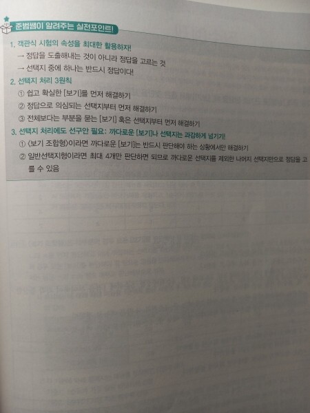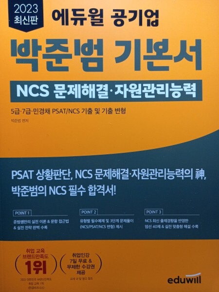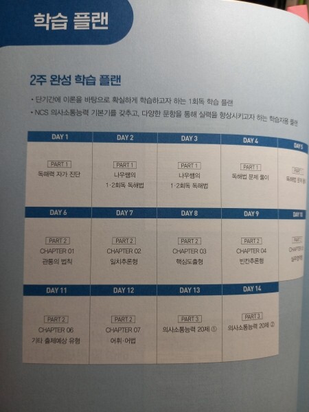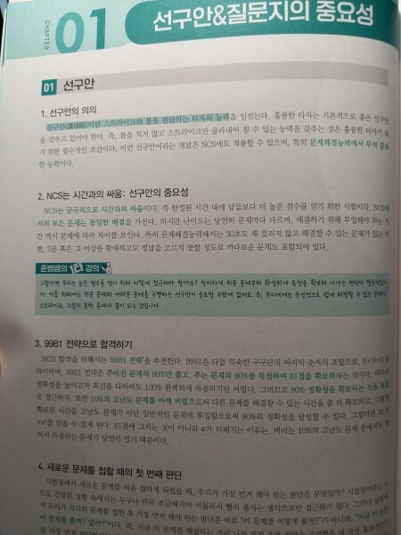 이 책은 독해법과 각 유형들에 대한 이론을 제시하고 기본 유형 연습문제와 psat 기출 연습문제, ncs 응용 연습문제순으로 문제가 실려 있어 저와 비슷한 고민을 하는 사람들은 파트 1 이후 자신이 못하는 파트만 집중적으로 풀면서 실력을 배양하는 것도 좋을 것 같습니다