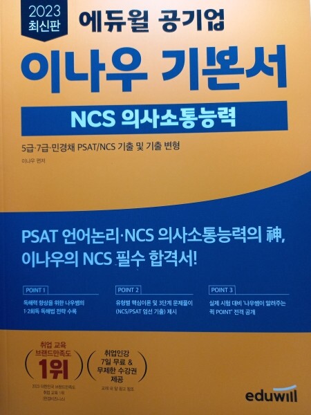 매번 어려운 의사소통능력 문제를 만나면 시간을 많이 잡아먹고 오답률이 높아서 고민하던 중 이나우 강사님이 ncs 의사소통능력 기본서를 낸다는 것을 알게 되어 이렇게 서평을 쓰게 되었습니다