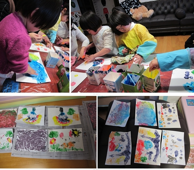 완성한 색풀 그림위에 얇은 종이를 덮어 찍어보게도 했더니