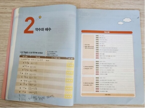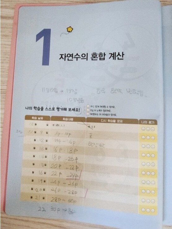 1단원 자연수와 혼합 계산을 학습 하면서 본인의 부족한 부분을 확인 하며 오답은 일단 보류 시키고 2단원 약수와 배수 학습 계획을 세우며 23년을 맞이 합니다~~