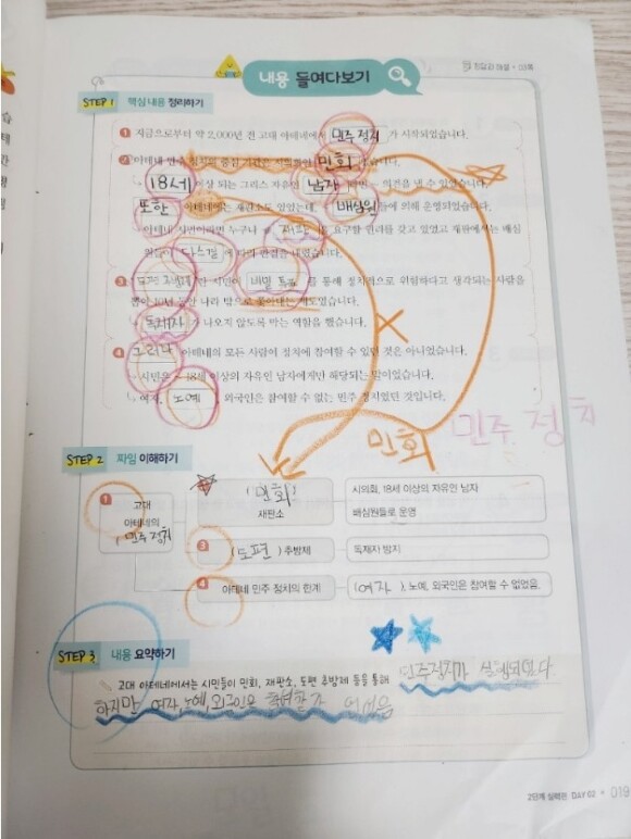같이 음독으로 지문을 읽으면서 중요 단어를 동그라미 치며 학습을 했는데요