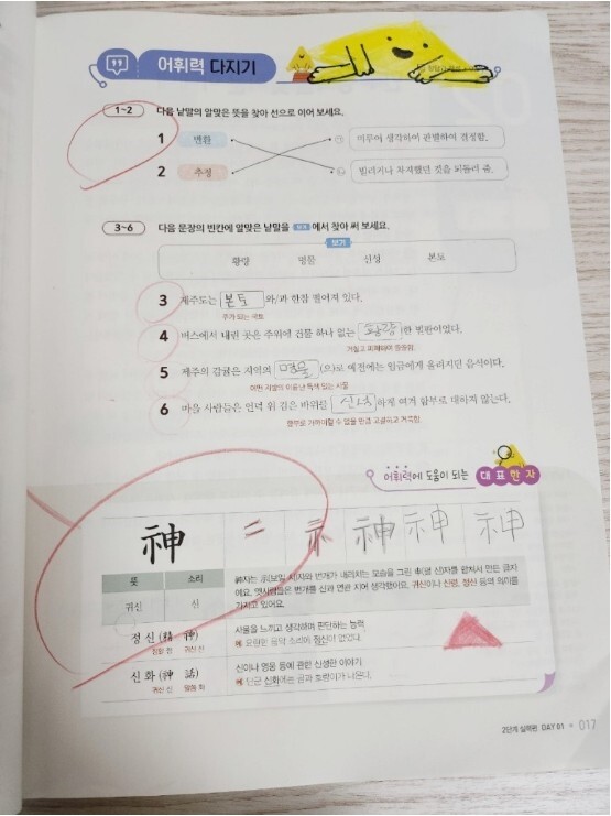 지문 속 낱말을 이루는 기초 한자들을 학습 할 수 있도록 구성 되었네요~