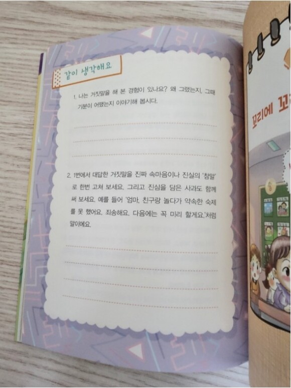 거짓말에 대해 감정도 생각해 보고, 그림도 그려보고, 착한 거짓말과 나쁜 거짓말을 생각 해 볼 수 있게 해주는 책이에요, 저와 아이와 착한 거짓말에 대해 대화를 나눠 봤는데요