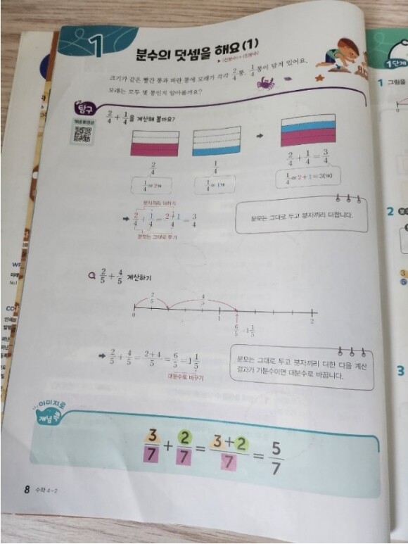 4학년2학기의 분수 내용이 3학년때 아이가 배웠던 부분, 5학년때 배울 내용과 연결 되는 걸 알려 주는데요