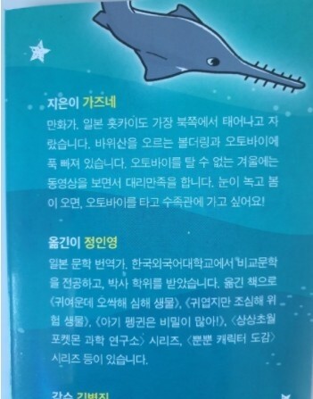 옮긴이 정인영 : 귀여운데 오싹해 심해 생물, 귀엽지만 조심해 위험 생물, 우리 집 미스터리 생물 도감, 외계인도 궁금해할 이상하고 재미있는 우주 이야기 83 ....이외도 많은 작품을 번역하셨네요.