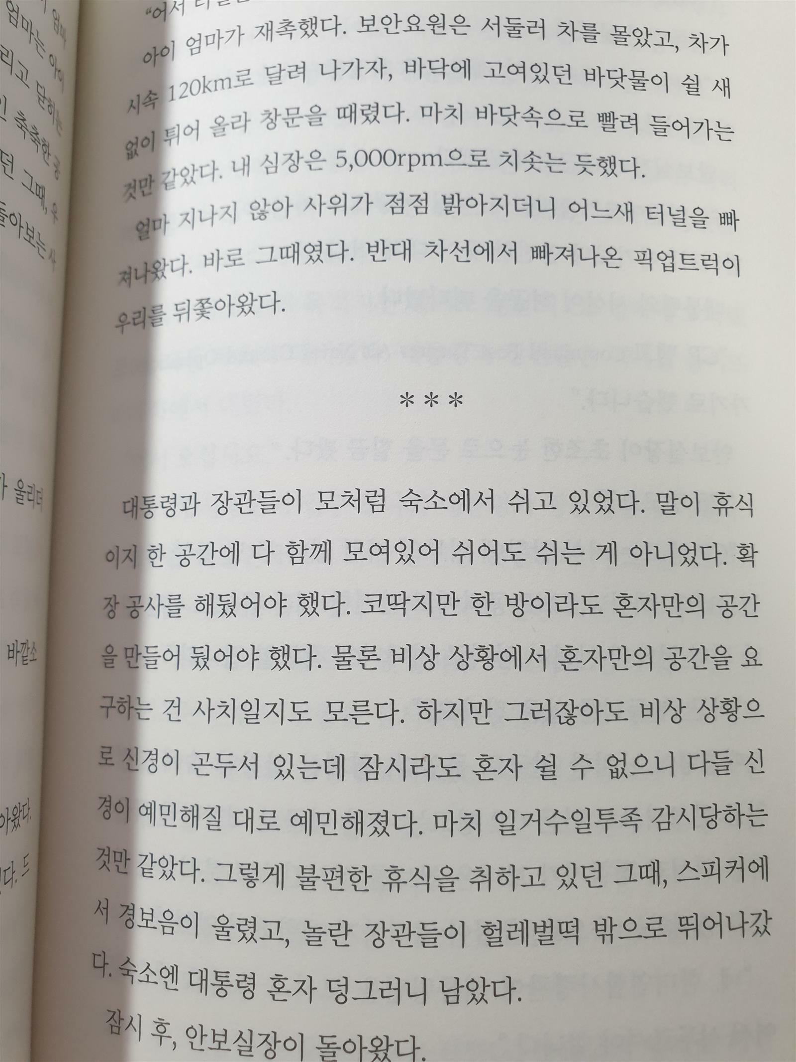 하지만 도시가 붕괴되고 고온의 더위가 덮친 서울에서 미국으로 떠나는 것은 혼자서는 도저히 할 수 없는 상황이었고 주인공이 살던 아파트의 몇몇 사람들이 서로 도와서 함께 미국으로 가자며 주인공과 함께 떠납니다. 그들은 아파트 보안요원, 게임폐인, 엄마와 어린아들, 전 국방부 장관 등이었는데 저마다의 방법으로 미국으로 갈 방법을 찾지만 결국 일행은 부산에서 배를 타고 일본으로 건너가 다시 비행기로 미국으로 가는 루트를 선택합니다. 좀비와 맞닥뜨린 위기에서 서로의 목숨을 구해가며 함께 부산으로 간 이들은 결국 함께 미국으로 가지는 못하고 부산에서 흩어지게 됩니다. 주인공도 온갖 고생을 해서 결말 부분에서는 미국으로 떠나게 된 것만 그려지고 미국에서 어떤 결말을 맞게 되는지는 보여주지 않습니다. 아무래도 작가가 미국에서 벌어지는 다음 이야기를 책으로 또 펴낼 것을 염두에 둔 것이 아닌가하는 생각이 듭니다.
